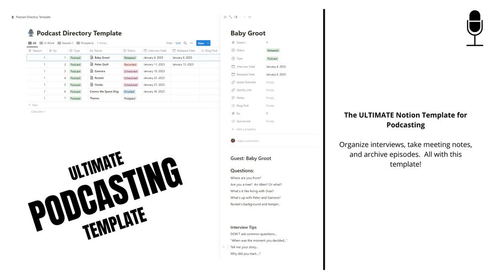 This Podcast Guest Template is your tool for organizing, scheduling, and creating interview notes for all of your guests! It also includes columns for including links to Apple and Spotify episodes, blog posts, and more! The Question Template includes areas to add Guest Names, Interview Questions, and Interview Tips and Tricks.